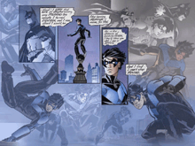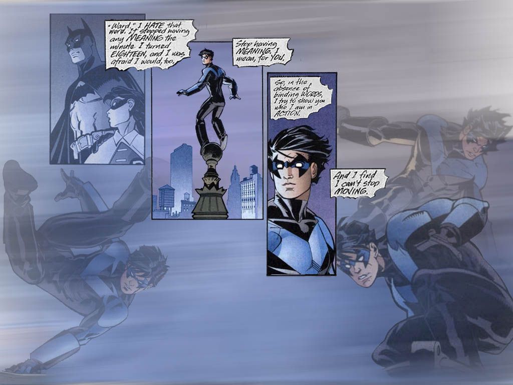 "Can't Stop Moving" -- frenetic version and slightly cleaner version. The text boxes are from Gotham Knights #14, part of a letter that Dick writes-- but doesn't send-- to Bruce. The art is from Patrick Zircher's run on Nightwing-- the left panel, of Robin & Batman, is from #75 (as is the Batman & Robin picture in the background). The other two panels in the foreground are from Nightwing 76. The background pictures are from various other issues in the #75-#80 range.